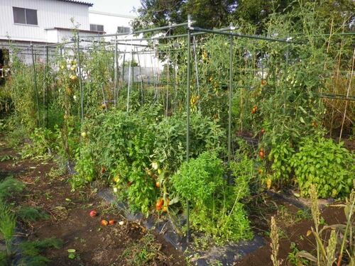 トマトと一緒に植えたバジル達、食べるだけで手入れをしていませんでした、花が咲き結実が始まったので、刈込をしてあげました。 この状態で、一輪車に二台ありました。 新たな脇芽に期待します。