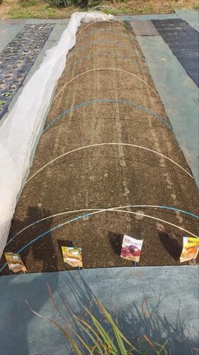 9/18種蒔きしました。 手前から、自家採種「早生かき菜」自家採種「晩生かき菜」自家採種「のらぼう菜」を三等分して蒔きました。
