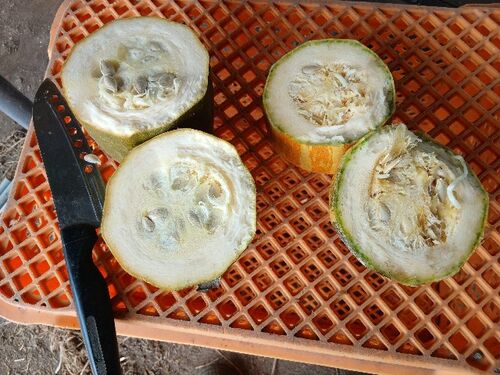 固定種ズッキーニ「ココゼリ」の完熟した実です。 自家採種するために育てて居ました。1本有れば十分なのですが、収穫残りで形の良い物を残して置きました。 先に収穫済みの固定種ズッキーニ「バンビーノ」バットが1本有るので両方から自家採種します。