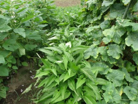 2009-07-24 空芯菜 #空芯菜 先日アップし、食べきれない収穫量の畑の空芯菜です。胡瓜の棚の両脇に5本植えてあります。昨年の畑では、育ちが悪かったので、今年は、畑のあちこちに植えて見ました。すると、どこに植えた物も元気に育ち・・・。ちなみに、右画像の手前に見えているズッキーニは、枯れてしまったのかと思うほど変になってしまったものが、自家再生してきた物なんです。小さい実が着いてきています。