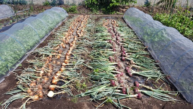 2017-05-29 乾燥中 #たまねぎ #赤たまねぎ 先週に収穫乾燥をしたかったのですが、雨だったりと色々と時間が取れずに、ずれ込んだ。 左が保存用「交配貯蔵玉葱」右が赤玉葱「サラダレッド」です。 昨年は、葉が完全に倒れて、枯れた物を収穫したら、保存中に腐った物が多く出た。色々と調べたら、完熟した物(葉が枯れるまで畑に置いた)のを乾燥不足で保存したのが原因だったようなので、今年は、早めに収穫、畑で2日間乾燥する事にしました。