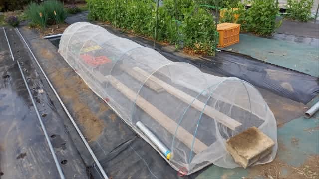 葱苗の跡地にマルチを張って、角材を置く。