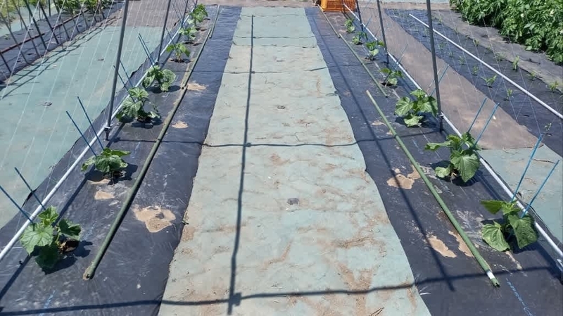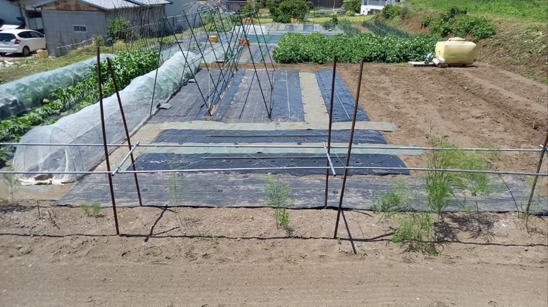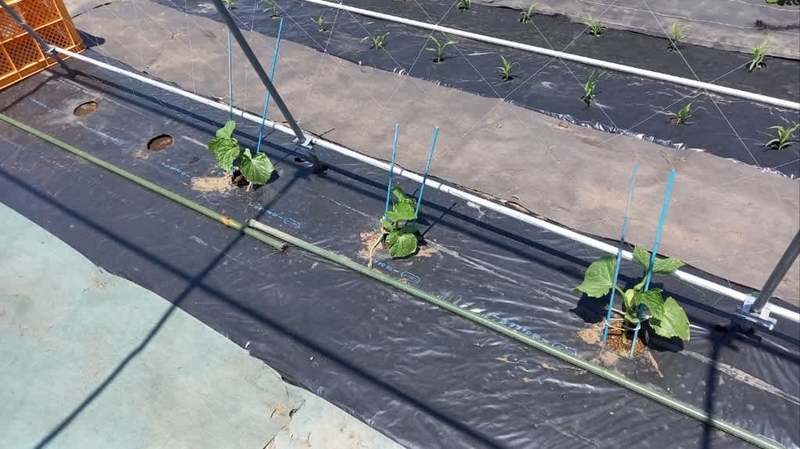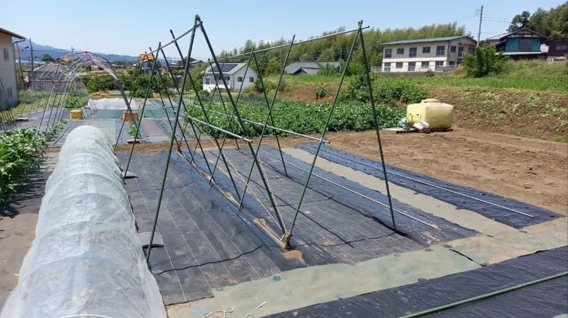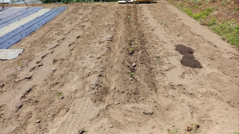 2024-05-20 自家の畑で農作業 #実家の畑 #渋川市北橘町 5/18実家の畑で農作業でした今回は、茄子畝の棚支柱を完成させて、胡瓜苗を植えて種蒔きし、「近江印度生姜」を里芋の間に植え付ける。そして、土手や家の周り、竹藪の草刈り。昼ご飯を食べてから、墓の草刈りをしてきました。何時もの定点撮影里芋を植えて新芽が出て来たので、株間へ「近江印度生姜」を植え付けました。茄子の支柱棚を完成させました。胡瓜2回目の植え付けと種蒔き、左が胡瓜「シャキット」です。手前4株は前回の植え付け、今回も4株で合計8株を育てます。右側は固定種「四葉 胡瓜」です、前回が3株で今回は4株の計7株です。今回植えた奥2か所に固定種「四葉 胡瓜」の種蒔きをして置きました。胡瓜「シャキット」です「カメハメハ西瓜」は元気よく育ってくれてます。直蒔きは6か所ですが、1か所発芽してくれませんでした。追加蒔きをしたいのですが、「カメハメハ西瓜」の種が手に入りません。エンドウ3種を撤収した畝に、不耕起のまま植え付けたメロン6株です。